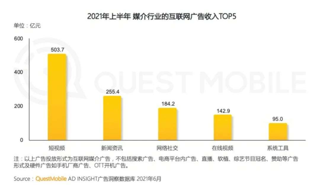 据QM数据显示,2021年上半年在线视频行业广告投放高达142.9亿元,这其中主要是以腾讯视频、爱奇艺、优酷等为主;落后于短视频上半年503.7亿投放,以及新闻资讯端255.4亿元。